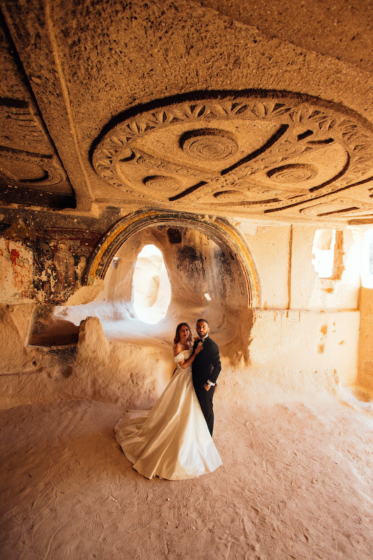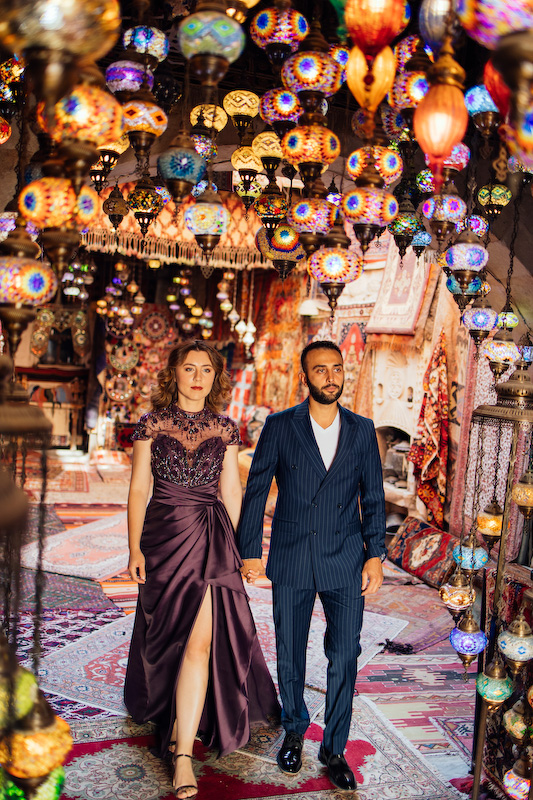 Otantik halıların serildiği eski bir avluda, renklerin ve dokuların arasında yürüdük önce. Halıların desenleri, Kapadokya’nın geçmişinden bugüne taşıdığı hatıralar gibiydi. Yasemin’in zarif duruşu, Özgür’ün sakin gülümsemesiyle birleşince, fotoğraf çekmek değil de bir anıyı saklamak gibi hissettirdi. Deklanşöre her bastığımda, bu coğrafyanın onların aşkını çoktan kabul ettiğini düşündüm.