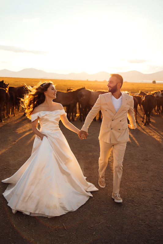 Gün batımına yaklaşırken toprak kızıl bir renge büründü. Ufuk çizgisi uzadı, gölgeler yumuşadı. Ve yılkı atları çıktı karşımıza… Özgürce koşan, rüzgârla yarışan atların arasında yapılan çekim, günün en unutulmaz anı oldu. Güneş, Kapadokya’nın ardında yavaşça kaybolurken Yasemin ve Özgür’ün yüzlerinde sadece mutluluk vardı. O an, fotoğraf değil; bir masalın son cümlesini yazıyorduk.