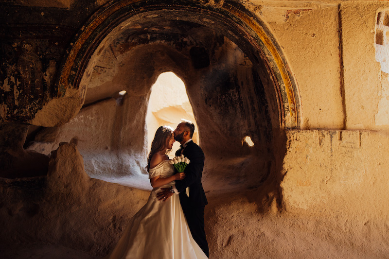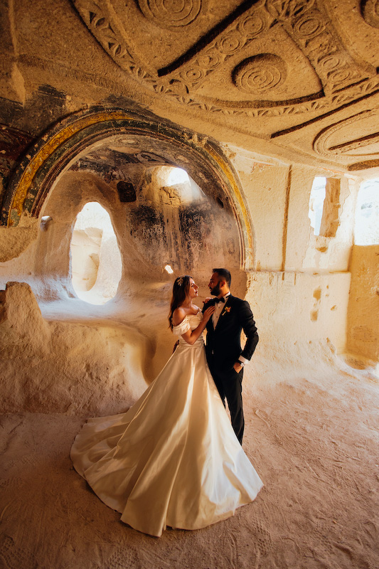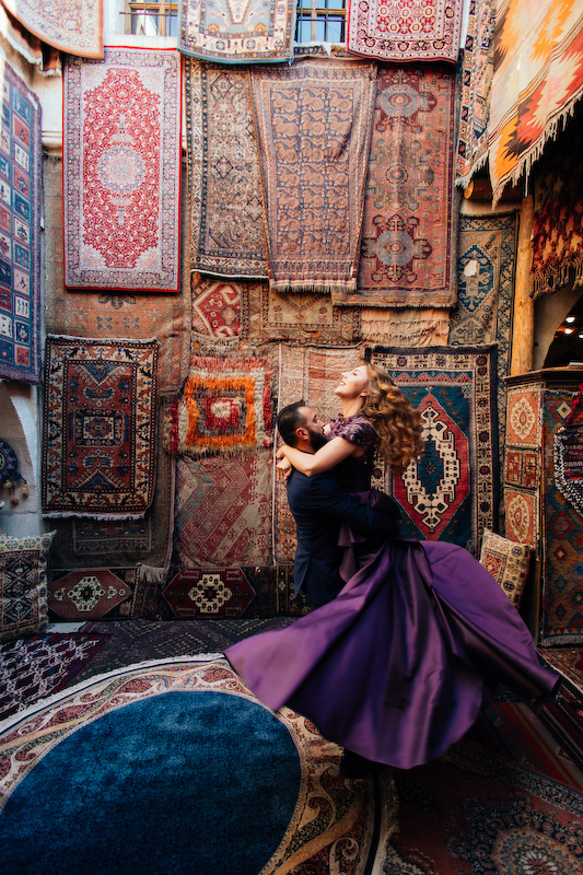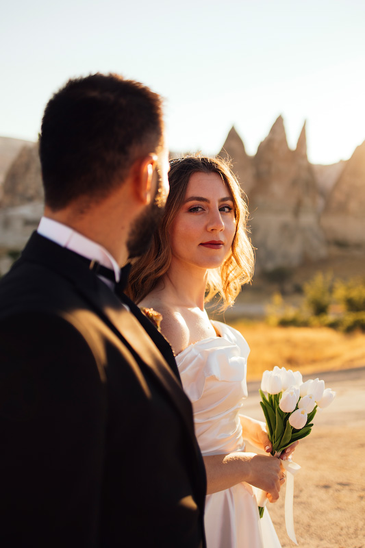 Otantik halıların serildiği eski bir avluda, renklerin ve dokuların arasında yürüdük önce. Halıların desenleri, Kapadokya’nın geçmişinden bugüne taşıdığı hatıralar gibiydi. Yasemin’in zarif duruşu, Özgür’ün sakin gülümsemesiyle birleşince, fotoğraf çekmek değil de bir anıyı saklamak gibi hissettirdi. Deklanşöre her bastığımda, bu coğrafyanın onların aşkını çoktan kabul ettiğini düşündüm.
