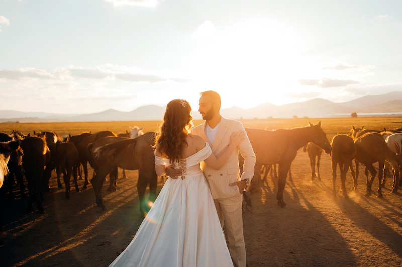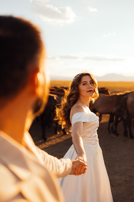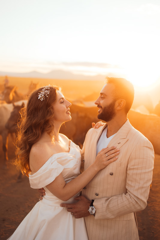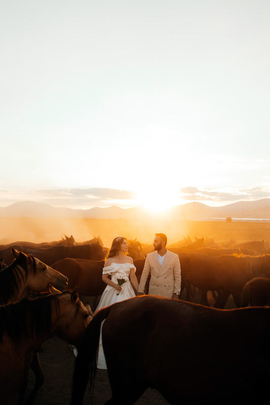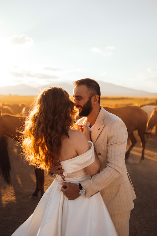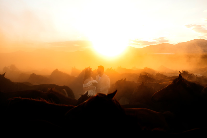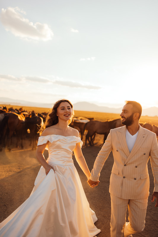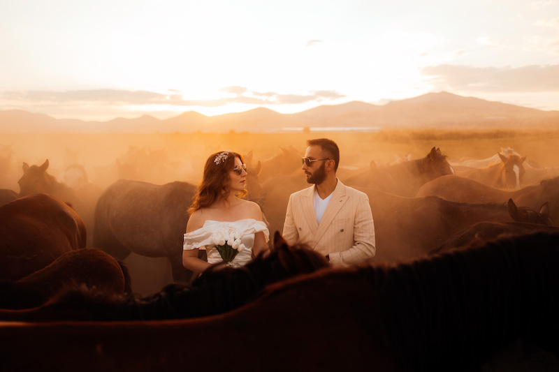 Gün batımına yaklaşırken toprak kızıl bir renge büründü. Ufuk çizgisi uzadı, gölgeler yumuşadı. Ve yılkı atları çıktı karşımıza… Özgürce koşan, rüzgârla yarışan atların arasında yapılan çekim, günün en unutulmaz anı oldu. Güneş, Kapadokya’nın ardında yavaşça kaybolurken Yasemin ve Özgür’ün yüzlerinde sadece mutluluk vardı. O an, fotoğraf değil; bir masalın son cümlesini yazıyorduk.