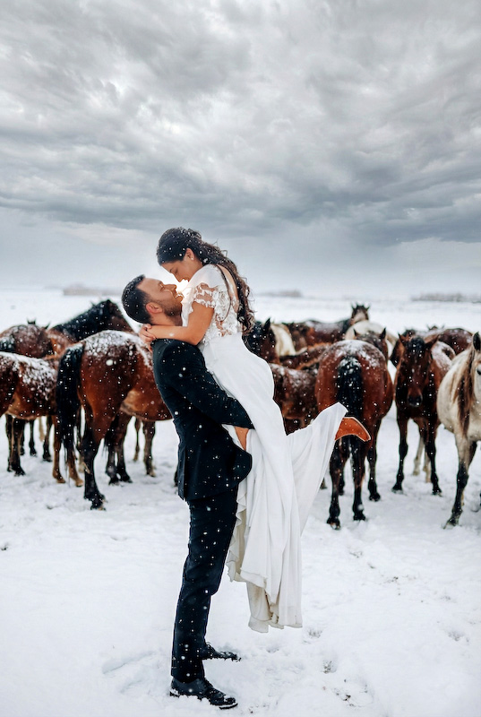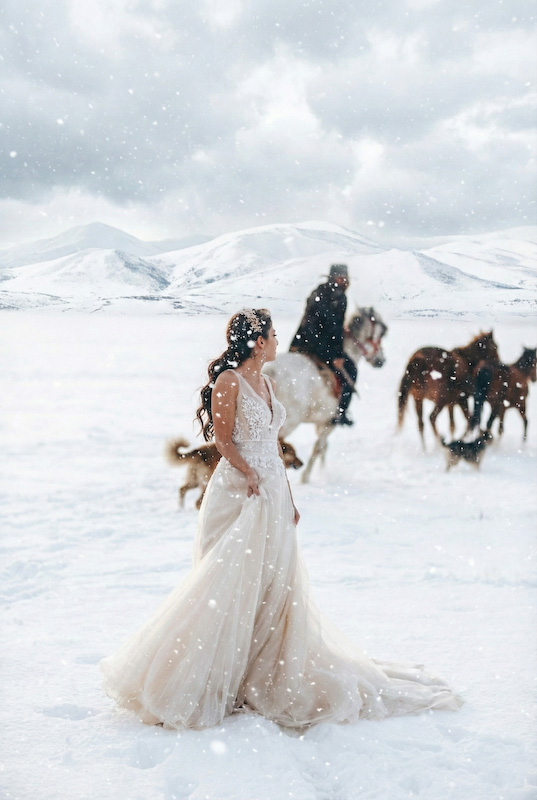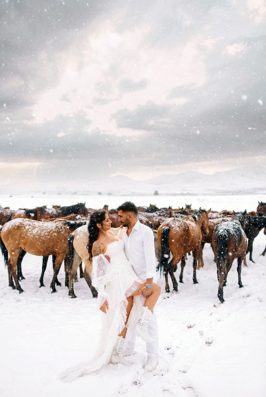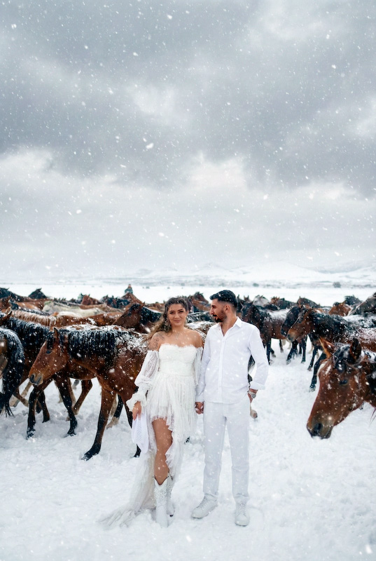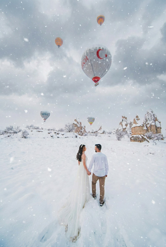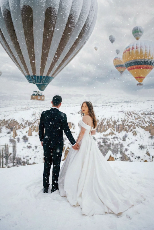 Yapay zeka destekli düğün fotoğrafları, klasik albümlerin ötesine geçiyor. Özellikle Kapadokya gibi zaten masalsı bir coğrafyada, kar atmosferiyle birleşince ortaya zamansız görüntüler çıkıyor. Yıllar sonra bakıldığında da eskimeyen, hep aynı duyguyu veren fotoğraflar…