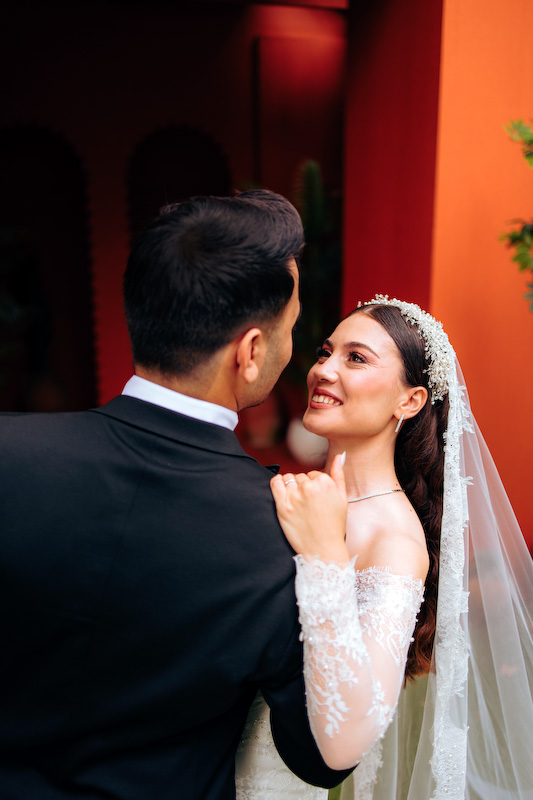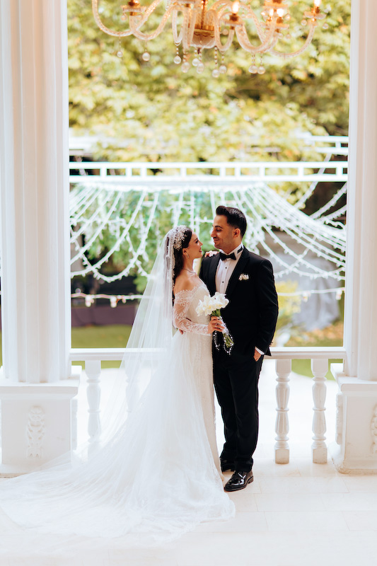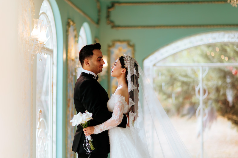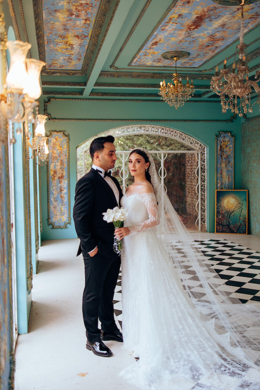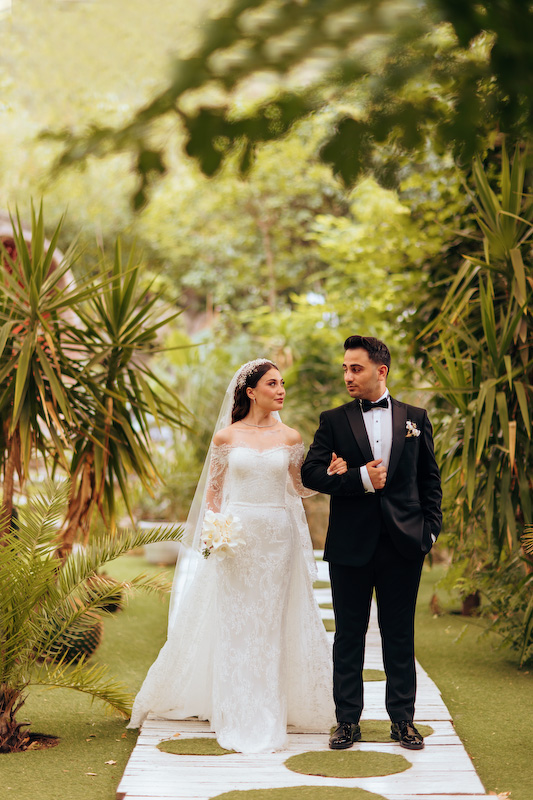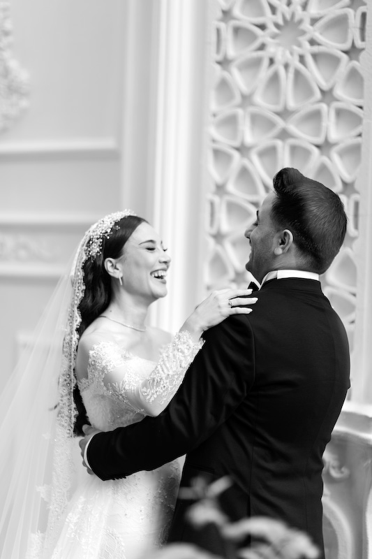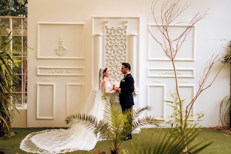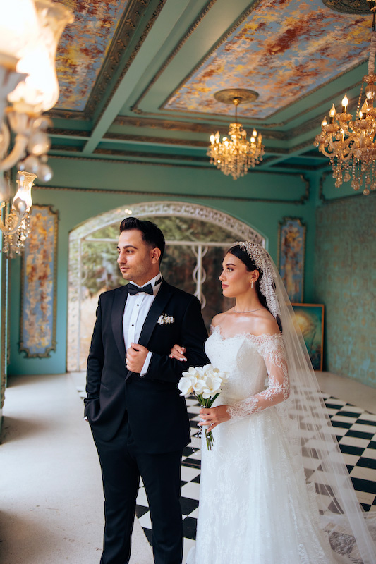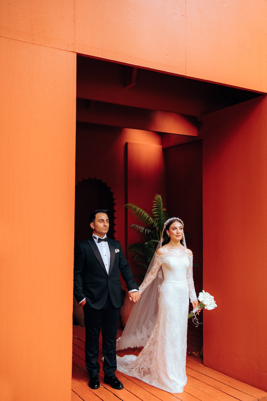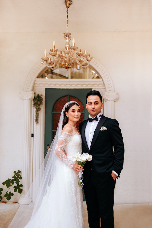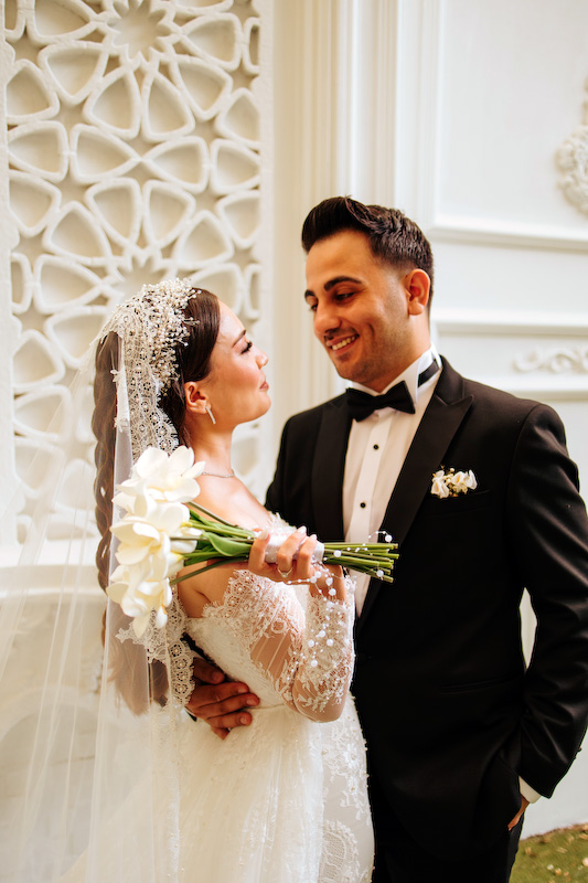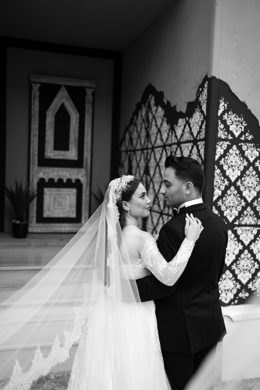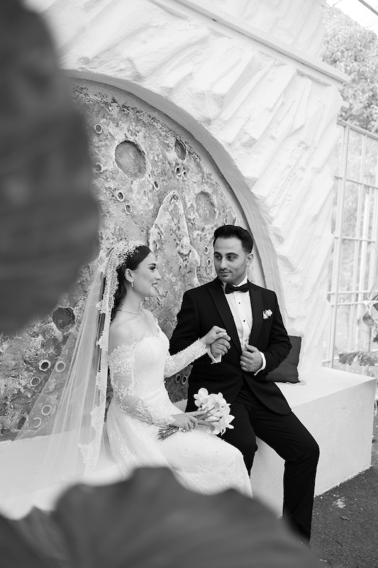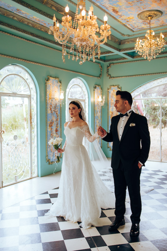 Damla’nın zarif gelinliği, Altınpark’ın dokulu duvarlarıyla yan yana geldiğinde ortaya zamansız kareler çıktı. Atakan’ın sakin ve koruyucu duruşu, her fotoğrafta hissedilen bir denge yarattı. Bir kapı aralığında, turuncuya çalan bir koridorda ya da desenli duvarların arasında; her sahnede aynı duygu vardı: sade, gerçek ve içten.
