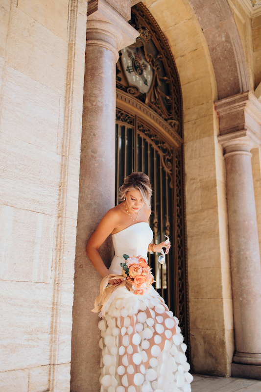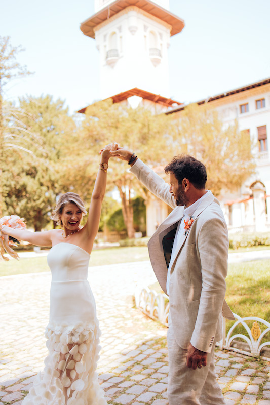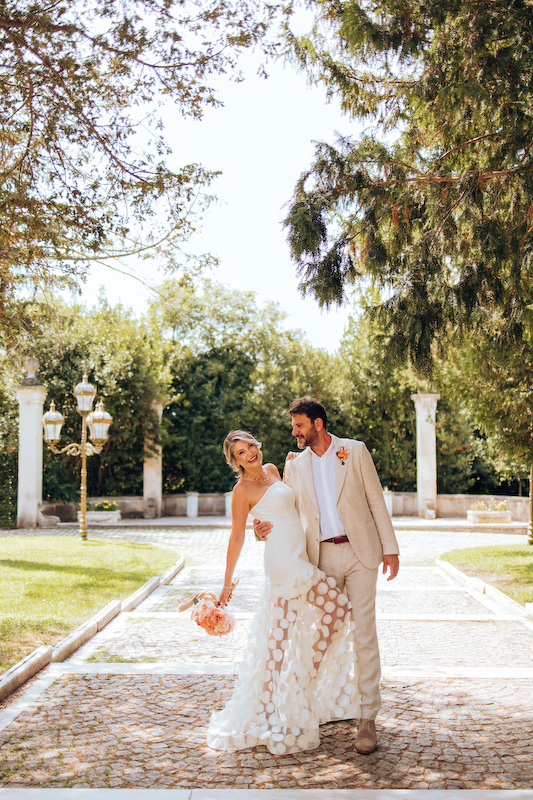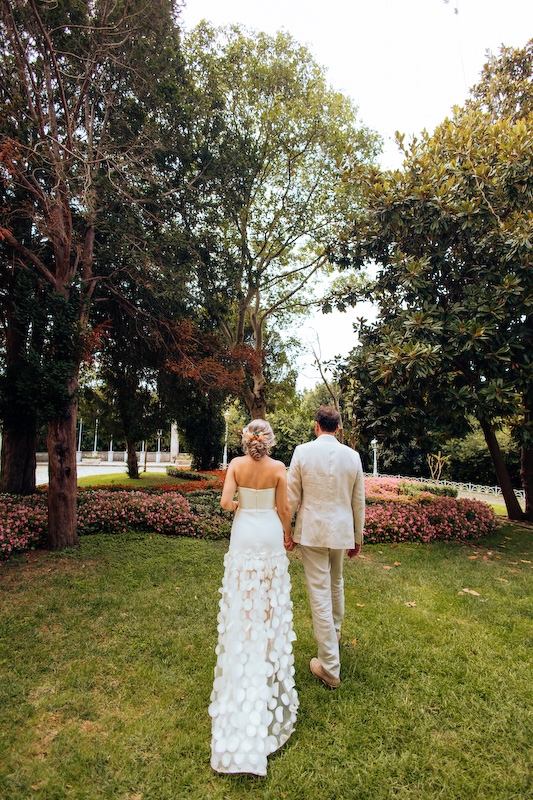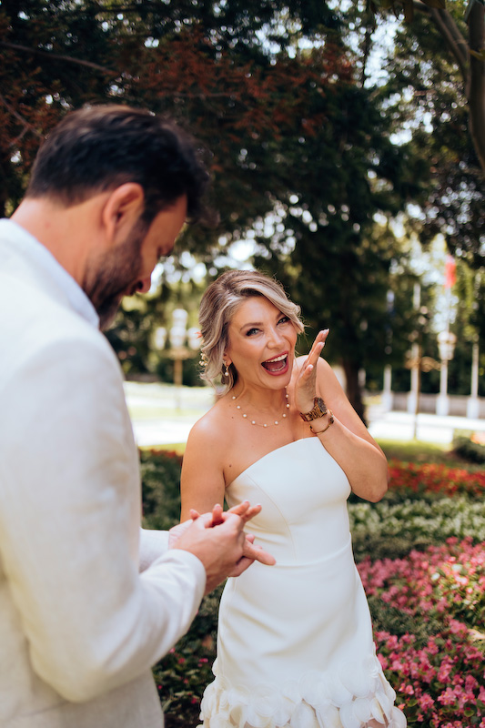Hidiv Kasrı düğün fotoğraf çekimi için İstanbul’un en özel noktalarından biri. Doğasıyla, mimarisiyle, ışığıyla her kareye ayrı bir derinlik katıyor. Nursel’in gelinliği çimlerin üzerinde başka, taş zeminlerde başka bir hikâye anlattı. Murat’ın sade ama şık tarzı bu hikâyeyi tamamladı.