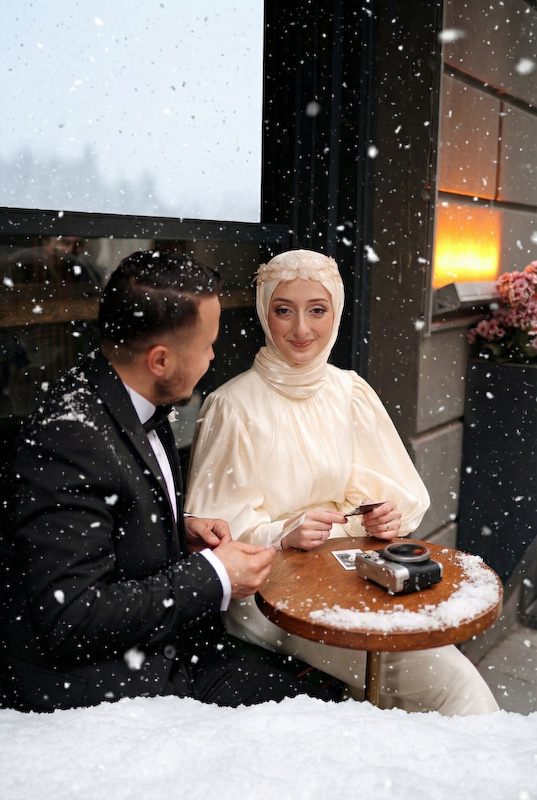 Yapay zekâ, düğün fotoğrafçılığında artık bir “efekt” değil, bir anlatı dili. Songül’ün zarif gelinliği karın beyazıyla konuşuyor, Zafer’in adımları daha kararlı, daha güçlü görünüyor. Yazın sıcaklığı gitmiş olabilir ama yerini daha derin, daha sakin bir romantizm almış.